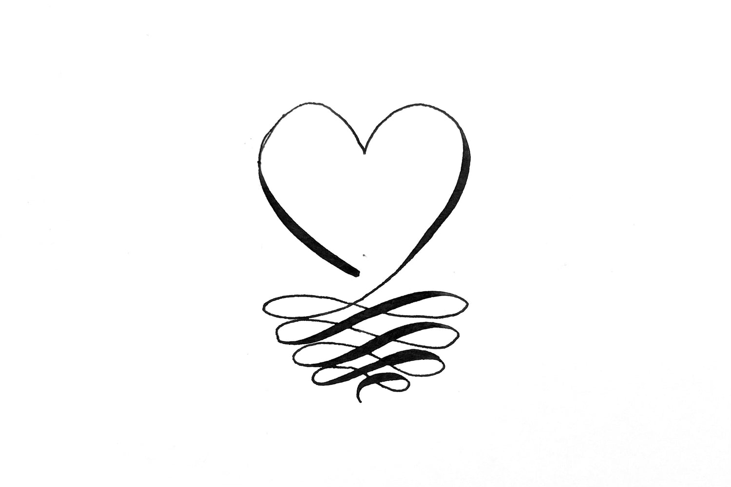 Rotate the paper 90 degrees to begin the flourish. Be careful not to smudge the wet ink on the heart. The flourish is made of the same basic figure-of-8s we practiced in the Flex Basics tutorial
