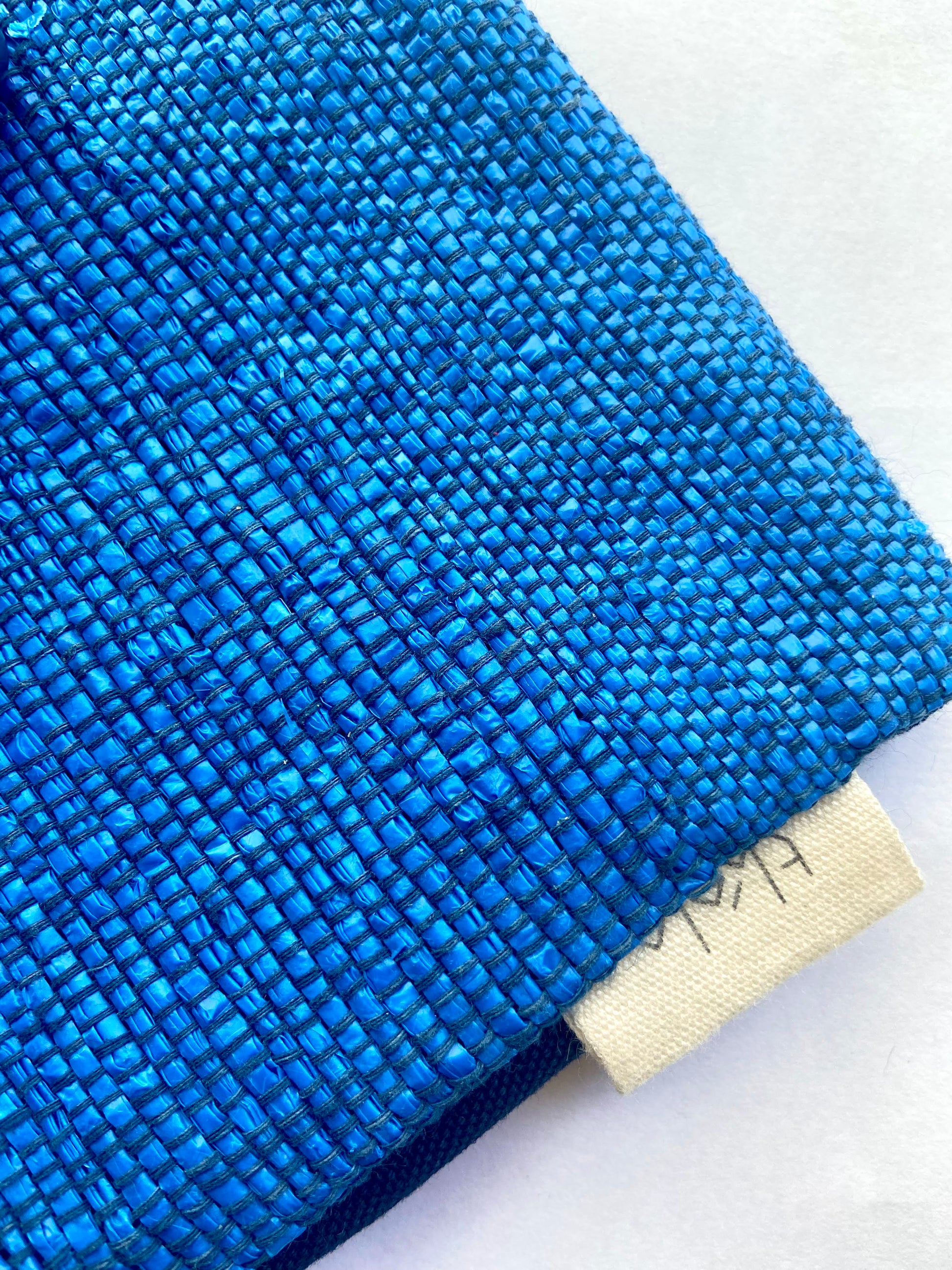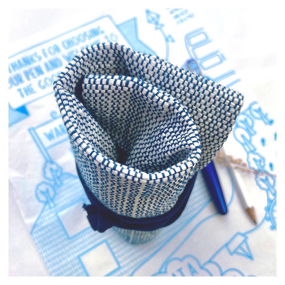 The outer material is their signature woven plastic fabric. It uses yarn hand cut from plastic waste as the warp. The weft is natural indigo dyed organic cotton. The inner material is organic cotton canvas, azo-free dyed. The antidote to fast fashion consumerism, every stage in the production of this product is carefully planned to be zero-waste and circular.